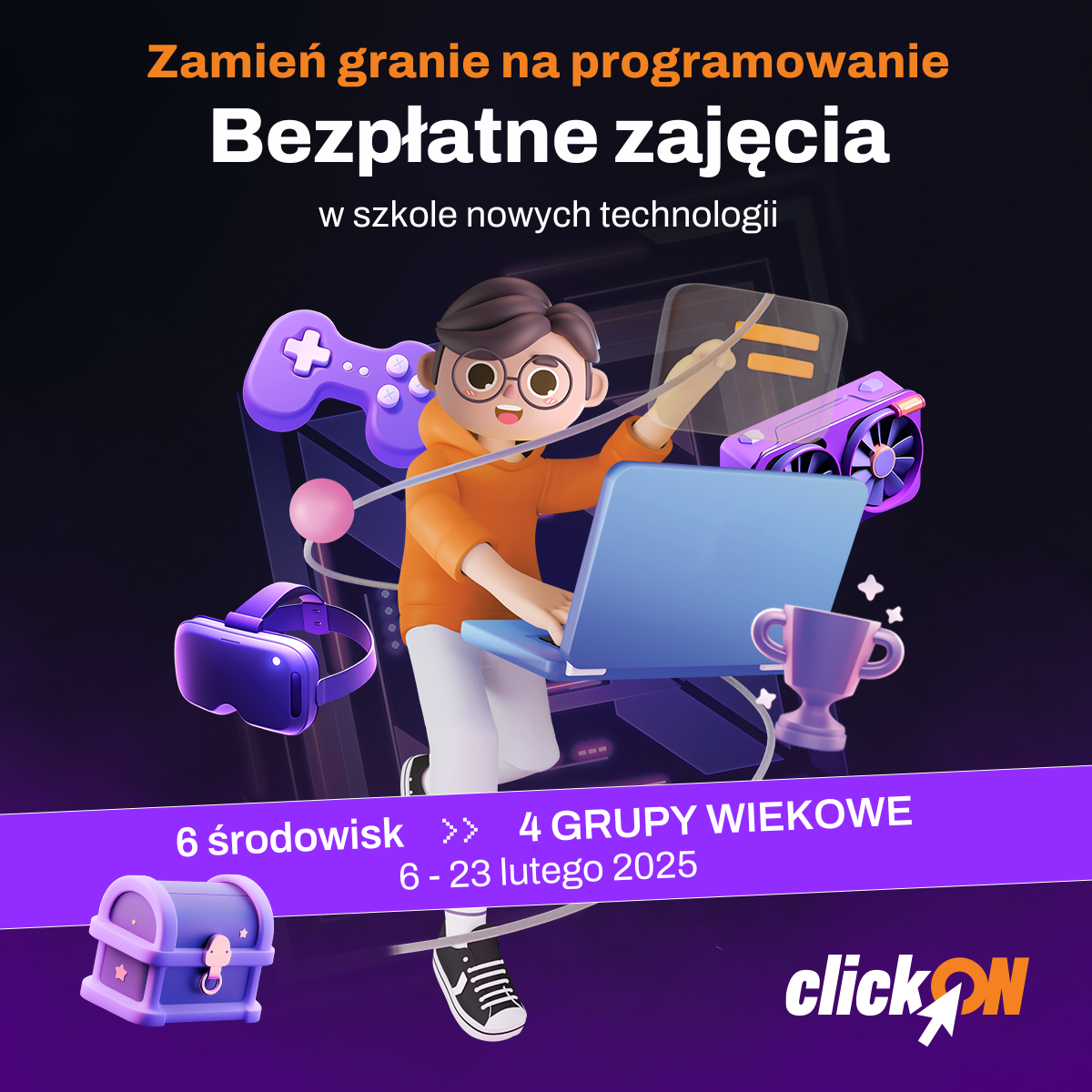 „ClickON” to ogólnopolska akcja edukacyjna, której celem jest pokazanie młodym ludziom, jak fascynujący i przyszłościowy może być świat programowania.