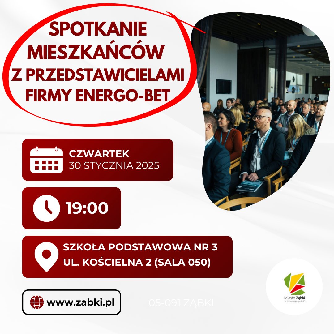 W związku ze złożoną petycją mieszkańców w sprawie działalności firmy ENERGO-BET uprzejmie informujemy, że spotkanie mieszkańców z przedstawicielami firmy ENERGO-BET odbędzie się w najbliższy czwartek (30 stycznia 2025 r.) o godzinie 19:00 w Szkole Podstawowej nr 3 w Ząbkach przy ul. Kościelnej 2 (sala 050).