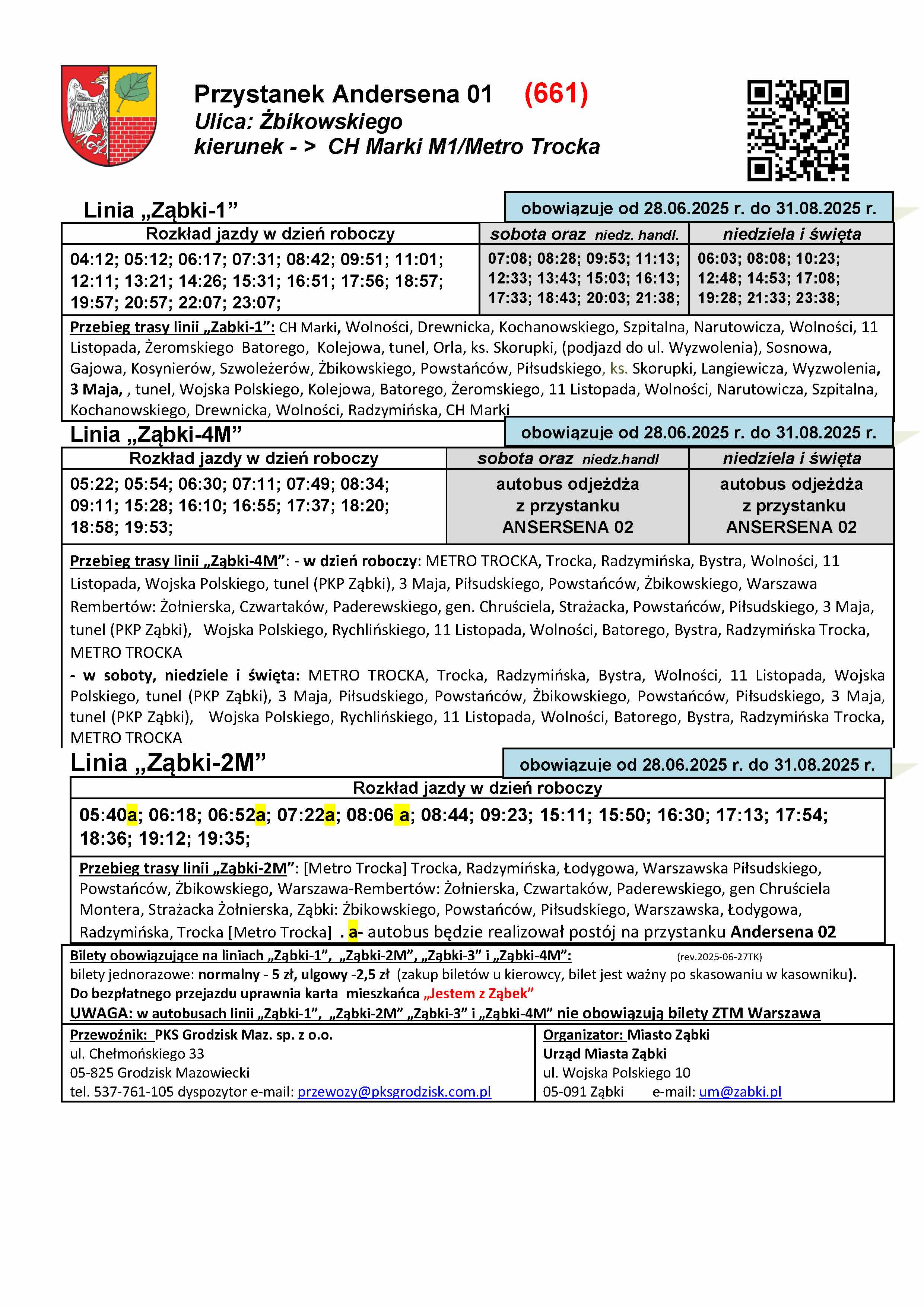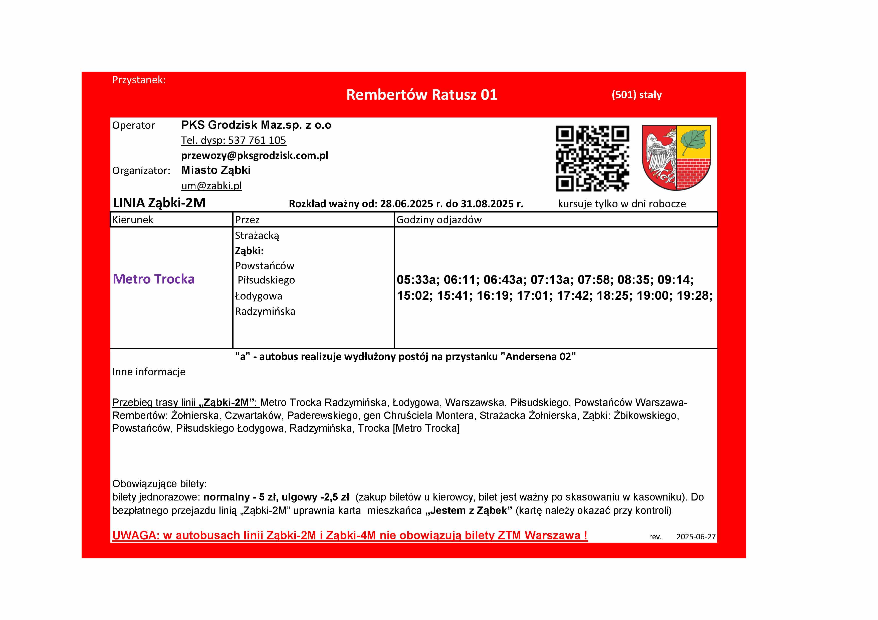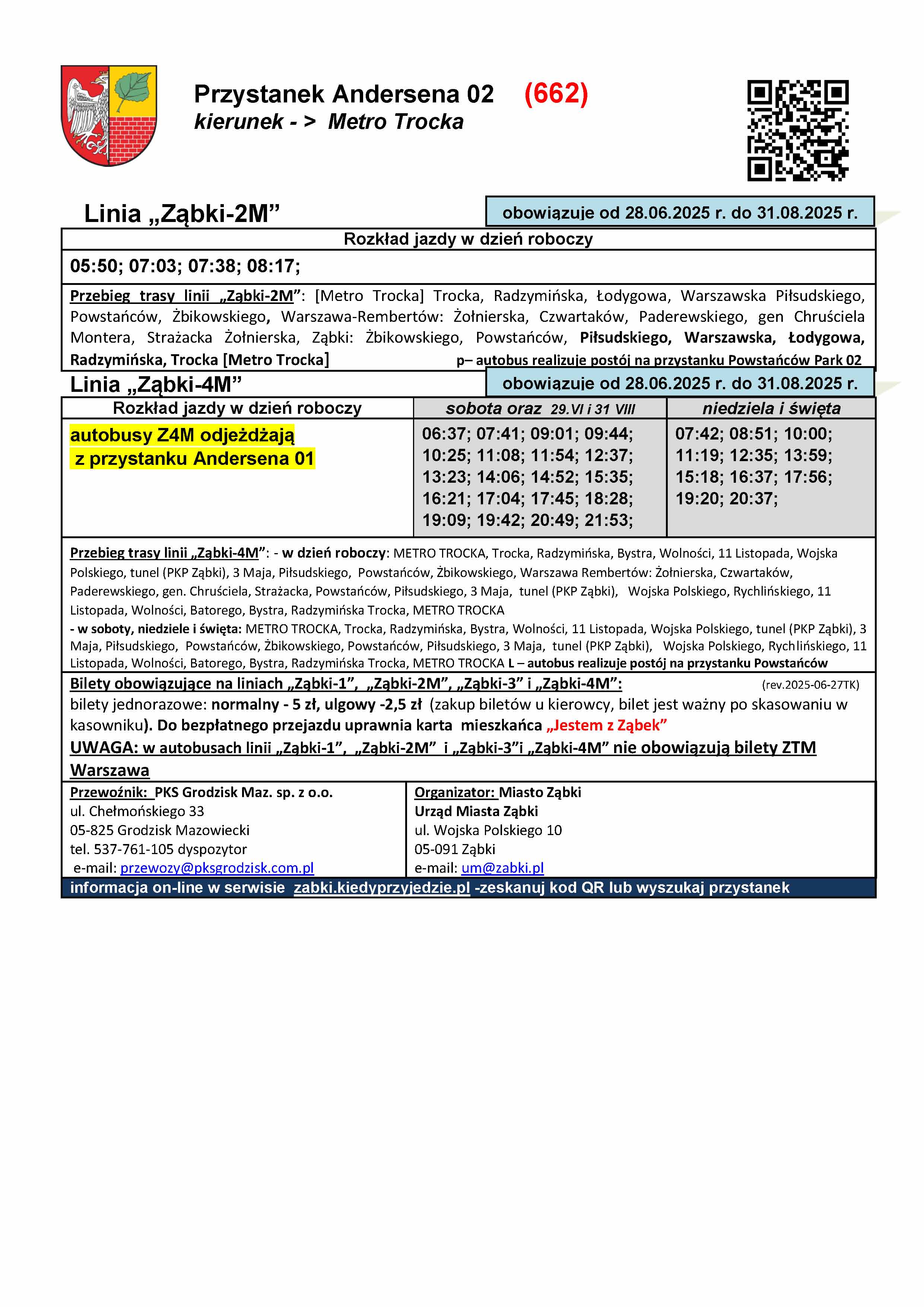 W związku z warunkami i ograniczeniami dotyczącymi korzystania przez nasze autobusy z pętli przy Metrze Trocka oraz z przystanków na terenie Warszawy, w celu koordynacji z kolejnym pociągiem, wybrane popołudniowe kursy linii Ząbki-2M oraz Ząbki-4M będą realizowały dodatkowym kilkuminutowym postój na przystanku Powstańców Park 02 (przed wyjazdem do Rembertowa), na tabliczkach przystankowych takie kursy są oznaczone literką "p" . Postoje te są również wyróżnione w rozkładach tabelarycznych. Natomiast w szczycie porannym aby uniknąć grupowania się autobusów Ząbki-2M i 4M oraz 245 w „tzw. stada” wprowadzono dla części porannych kursów linii Ząbki-2M postój na przystanku Andersena 02. Kursy te są oznaczone na tabliczkach literką „a” oraz wyróżnione w rozkładzie tabelarycznym. Tak oznaczone kursy, po przyjeździe z Rembertowa, obsłużą przystanek Andersena 01, następnie zawrócą na rondzie i podjadą na postój na przystanek Andersena 02 zlokalizowany po drugiej stronie ul. Żbikowskiego. Po zrealizowaniu postoju wyruszą w trasę w kierunku metra wyjadą ul. Szwoleżerów na DW631 i wjadą ponownie w ul. Powstańców, kolejnym obsłużonym przystankiem będzie Powstańców Park 01 (nie będzie ponownej obsługi przystanku Andersena 01) . Rozkład wakacyjny linii ząbkowskich będzie obowiązywał do 31 sierpnia o ile nie zajdą jakieś okoliczności, które wymuszą wcześniejszą zmianę rozkładu. W okresie obowiązywania rozkładów wakacyjnych będą dwie niedziele handlowe 29.VI i 31.VIII gdy będzie obowiązywał rozkład sobotni.