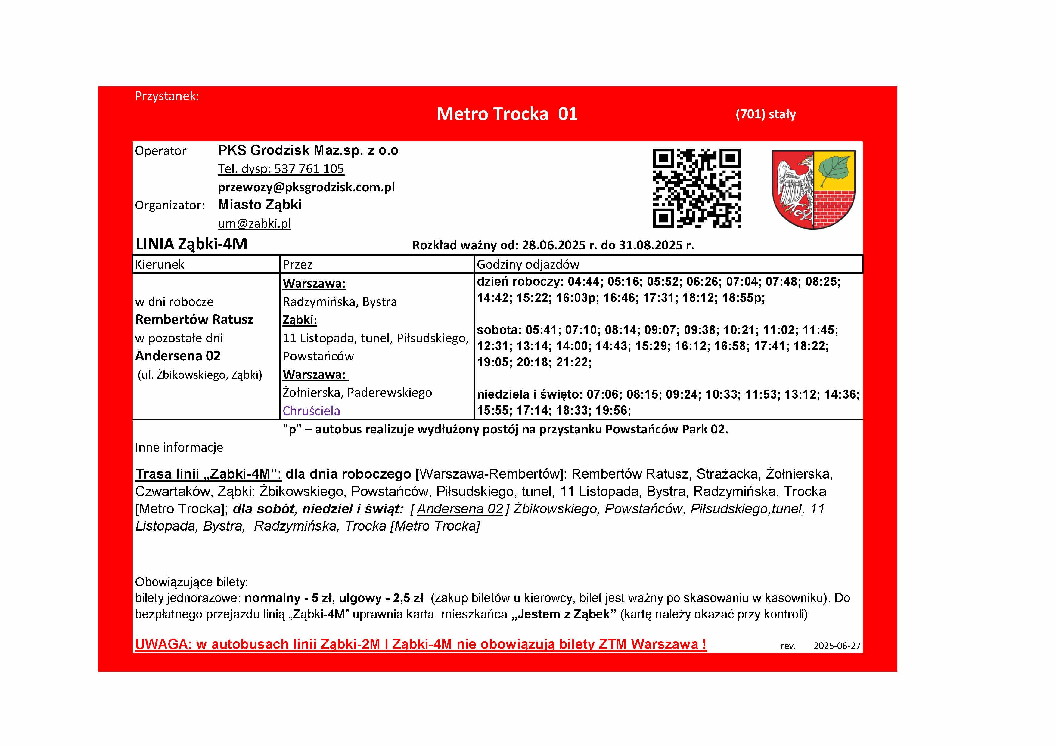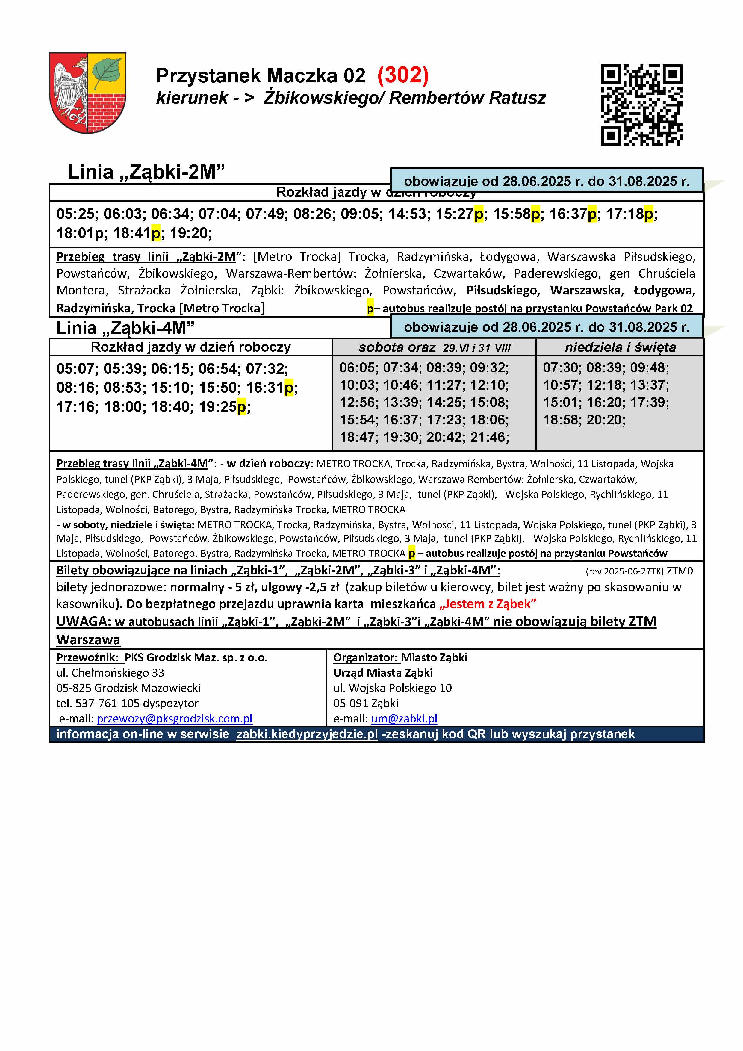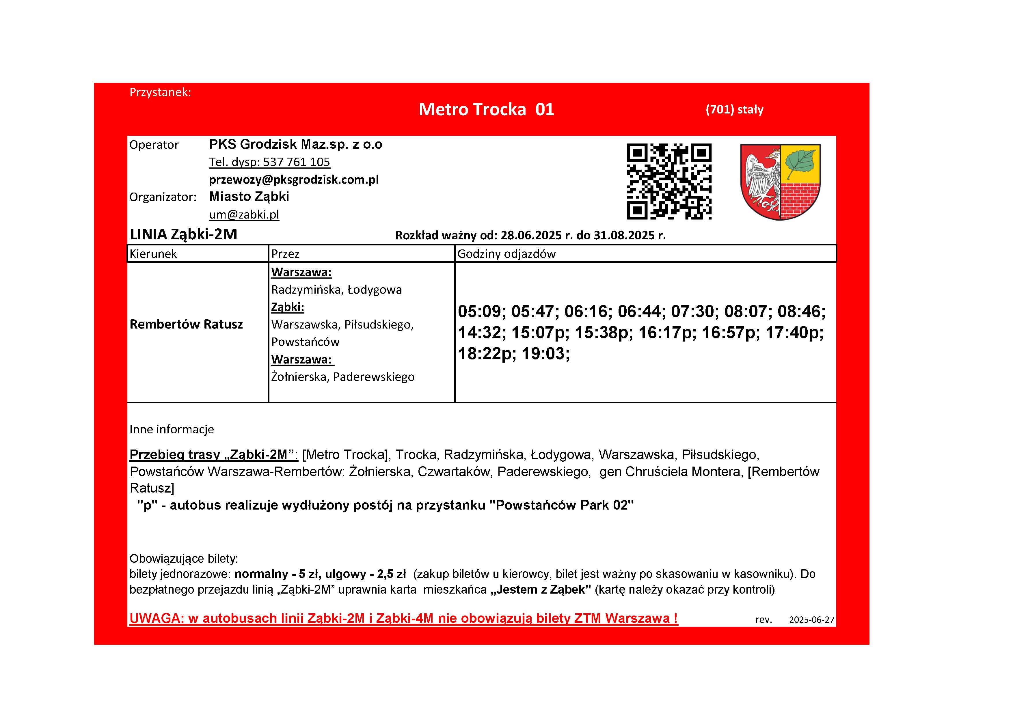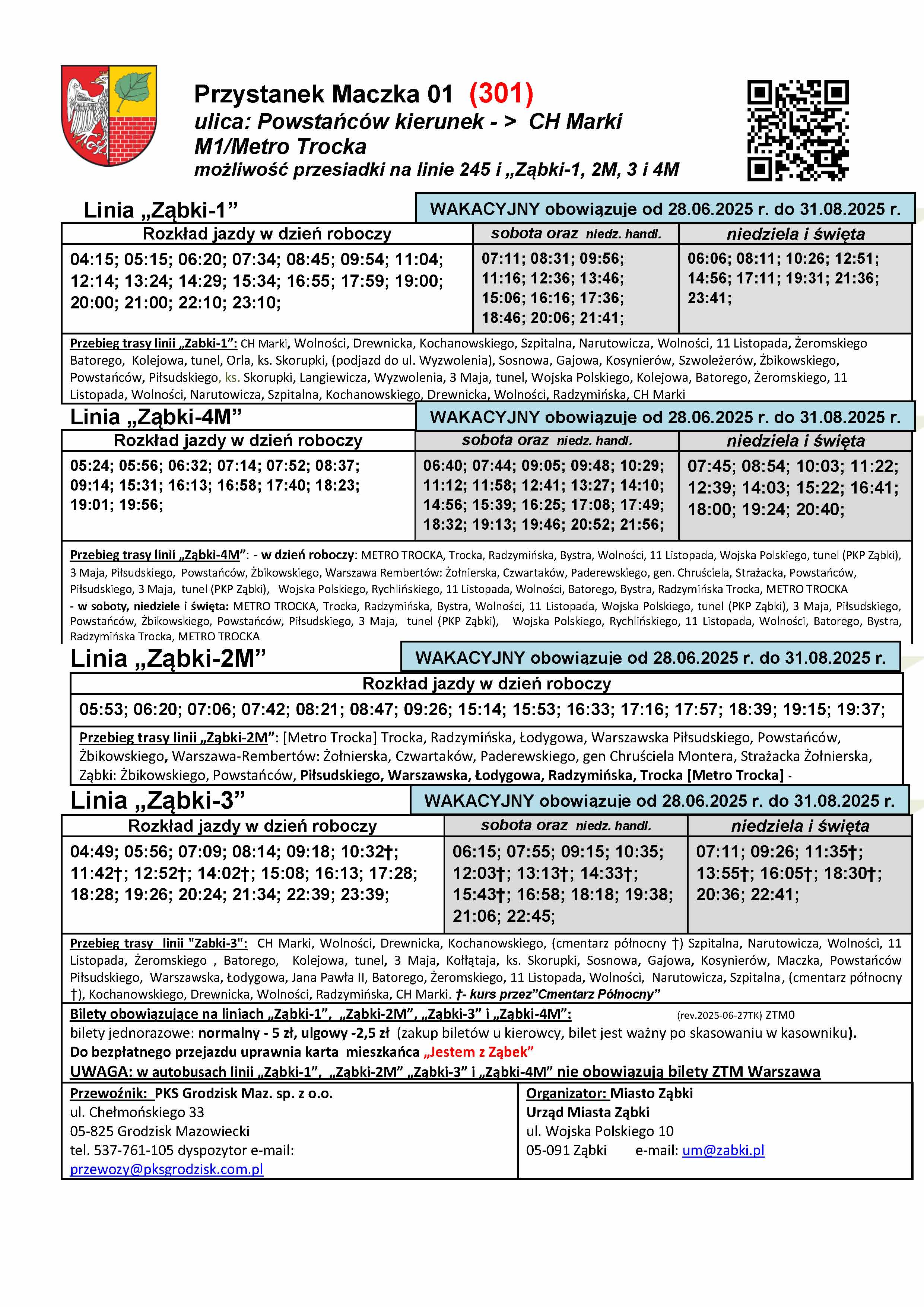 W związku z warunkami i ograniczeniami dotyczącymi korzystania przez nasze autobusy z pętli przy Metrze Trocka oraz z przystanków na terenie Warszawy, w celu koordynacji z kolejnym pociągiem, wybrane popołudniowe kursy linii Ząbki-2M oraz Ząbki-4M będą realizowały dodatkowym kilkuminutowym postój na przystanku Powstańców Park 02 (przed wyjazdem do Rembertowa), na tabliczkach przystankowych takie kursy są oznaczone literką "p" . Postoje te są również wyróżnione w rozkładach tabelarycznych. Natomiast w szczycie porannym aby uniknąć grupowania się autobusów Ząbki-2M i 4M oraz 245 w „tzw. stada” wprowadzono dla części porannych kursów linii Ząbki-2M postój na przystanku Andersena 02. Kursy te są oznaczone na tabliczkach literką „a” oraz wyróżnione w rozkładzie tabelarycznym. Tak oznaczone kursy, po przyjeździe z Rembertowa, obsłużą przystanek Andersena 01, następnie zawrócą na rondzie i podjadą na postój na przystanek Andersena 02 zlokalizowany po drugiej stronie ul. Żbikowskiego. Po zrealizowaniu postoju wyruszą w trasę w kierunku metra wyjadą ul. Szwoleżerów na DW631 i wjadą ponownie w ul. Powstańców, kolejnym obsłużonym przystankiem będzie Powstańców Park 01 (nie będzie ponownej obsługi przystanku Andersena 01) . Rozkład wakacyjny linii ząbkowskich będzie obowiązywał do 31 sierpnia o ile nie zajdą jakieś okoliczności, które wymuszą wcześniejszą zmianę rozkładu. W okresie obowiązywania rozkładów wakacyjnych będą dwie niedziele handlowe 29.VI i 31.VIII gdy będzie obowiązywał rozkład sobotni.