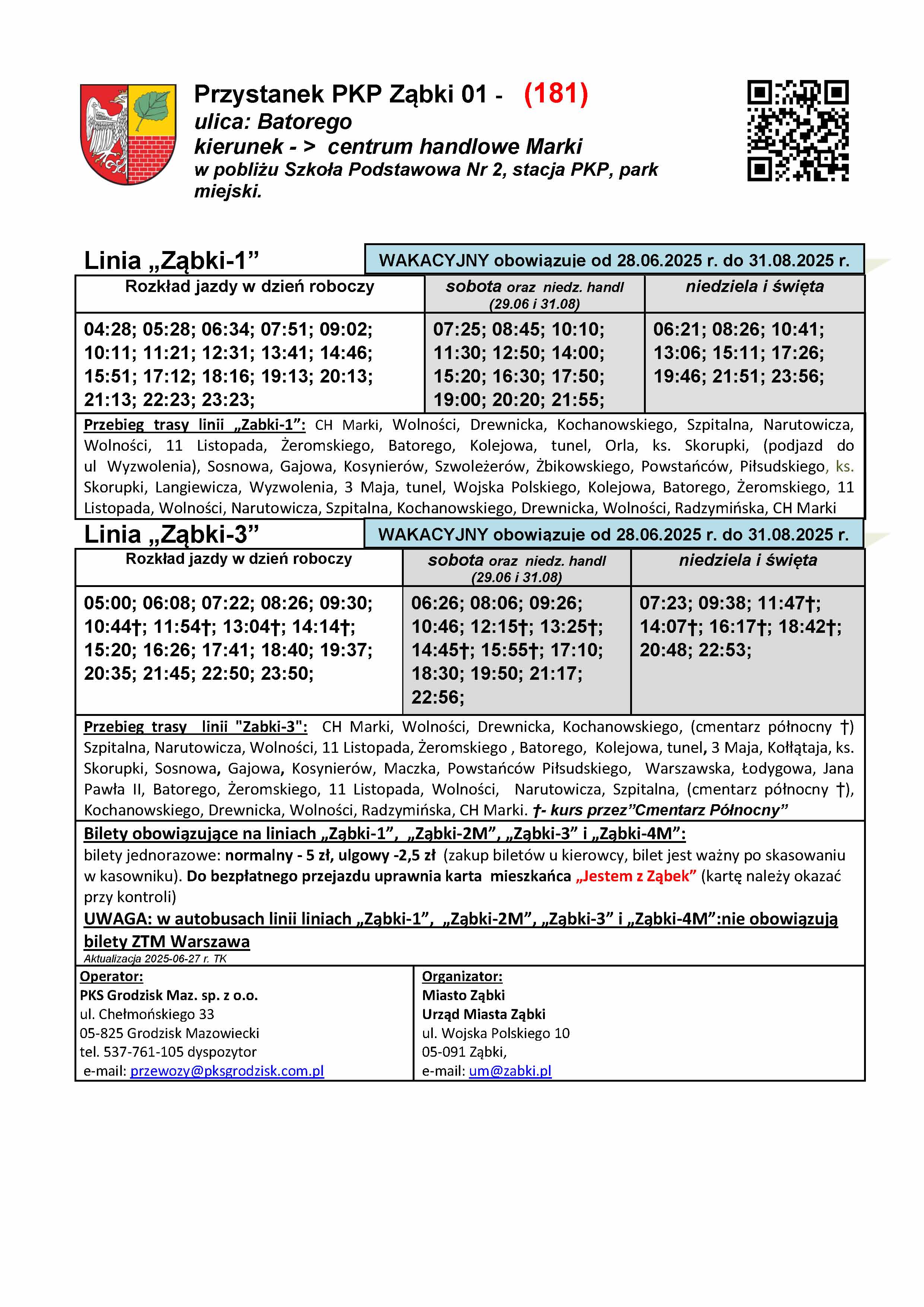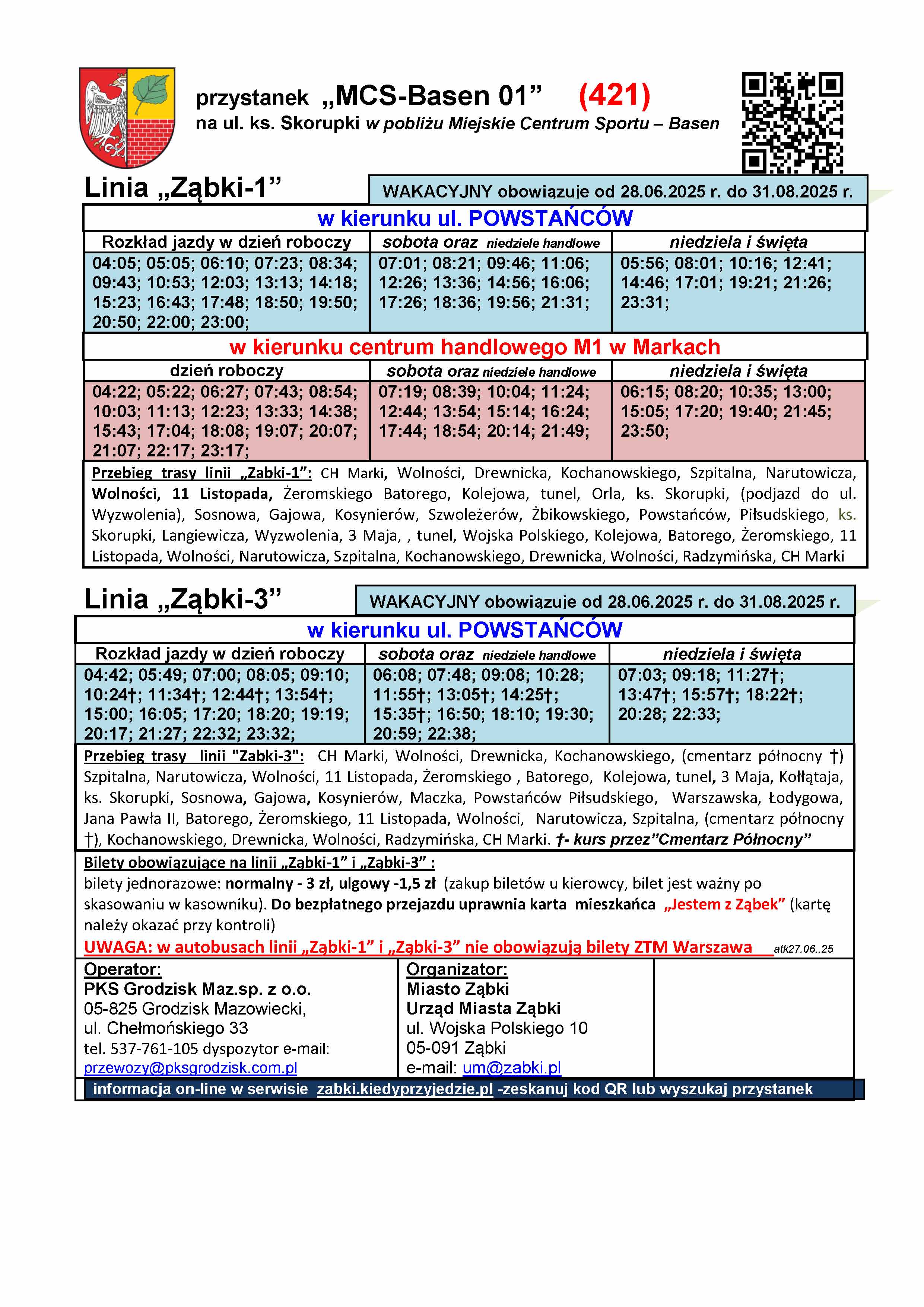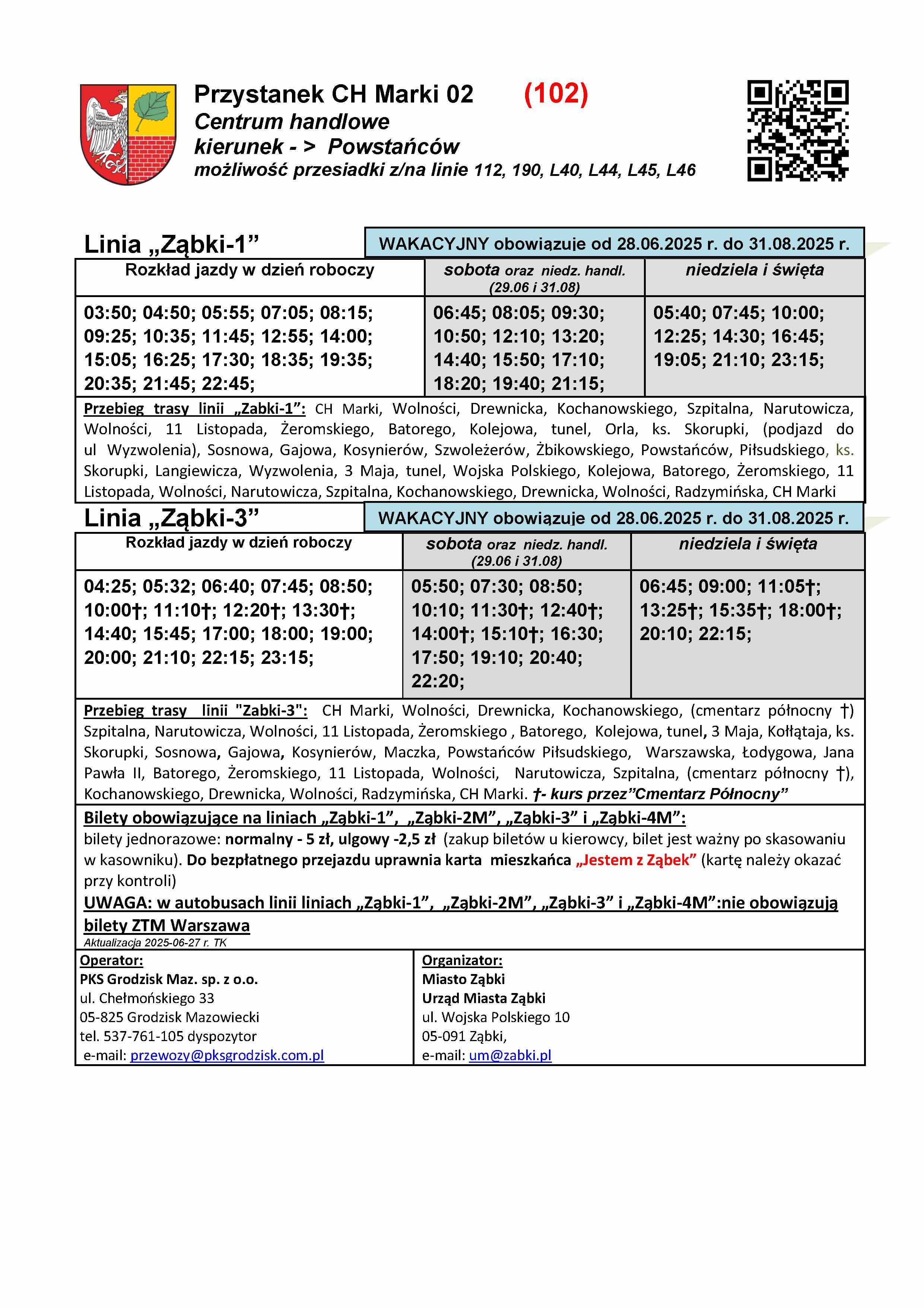 Rozkłady wakacyjne są dostępne na stronie miasta w zakładce "Komunikacja". W godzinach wieczornych w piątek (27.06) nowe rozkłady zawisną na przystankach na terenie Ząbek. Czekamy na aktualizację systemu kiedyprzyjedzie.pl oraz na aktualizację informacji przystankowej na terenie Warszawy, którą realizuje ZTM. Informujemy, że rozkłady Ząbkowskiej Komunikacji Miejskiej (na chwilę obecną tylko statyczne) są dostępne również na platformie https://zbiorkom.live/warsaw , którą przy okazji Państwu polecamy do śledzenia komunikacji ZTM w czasie rzeczywistym.