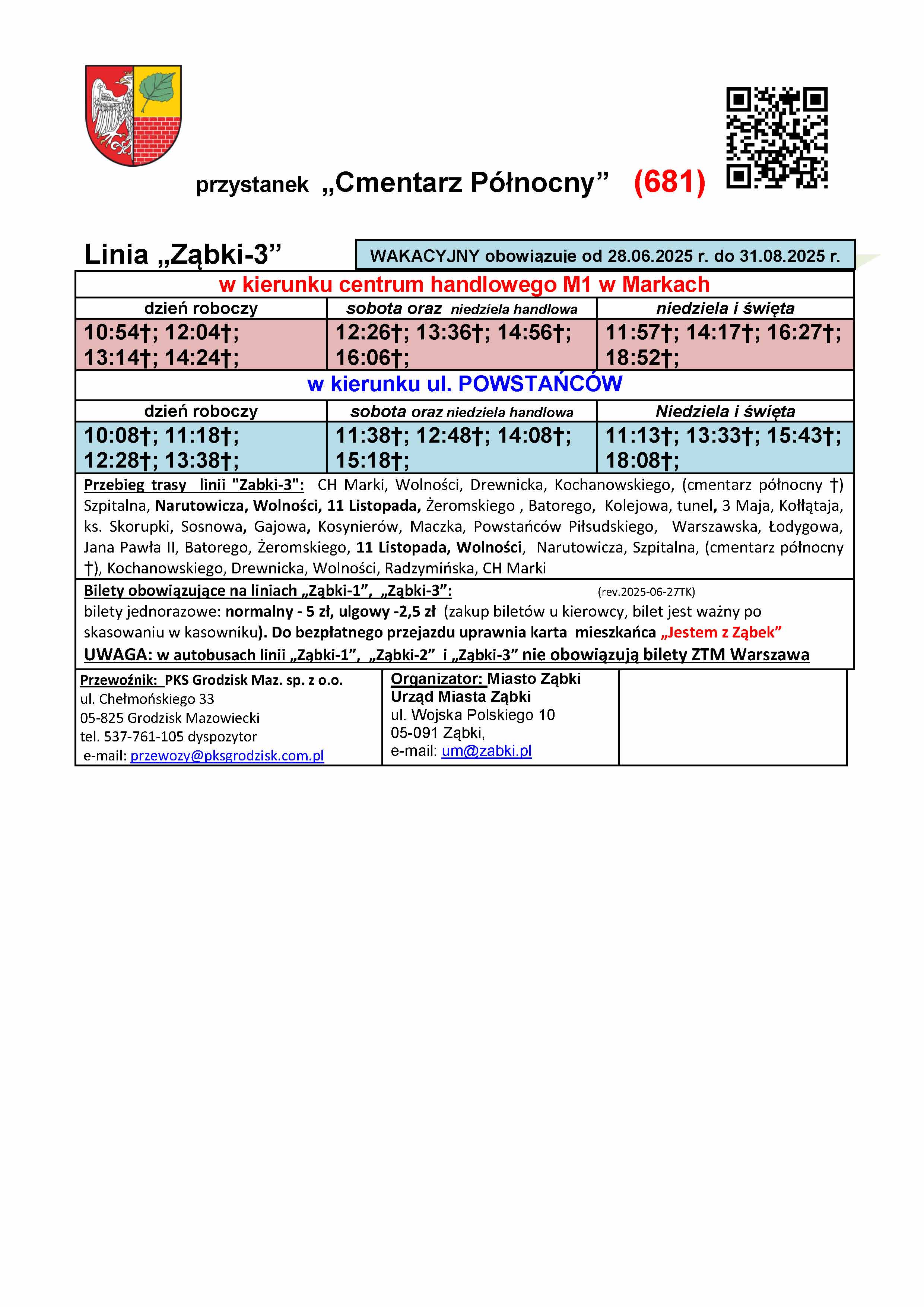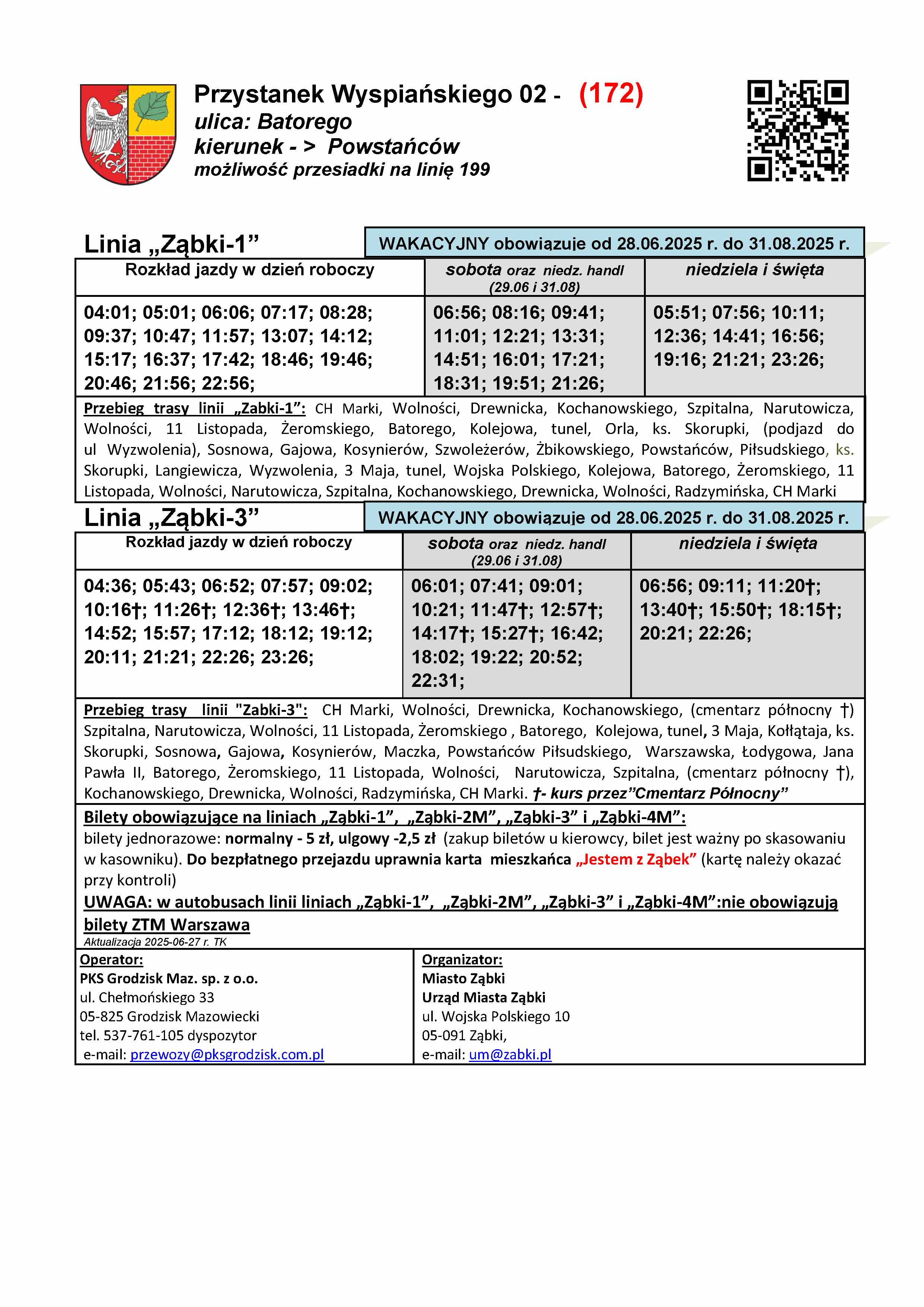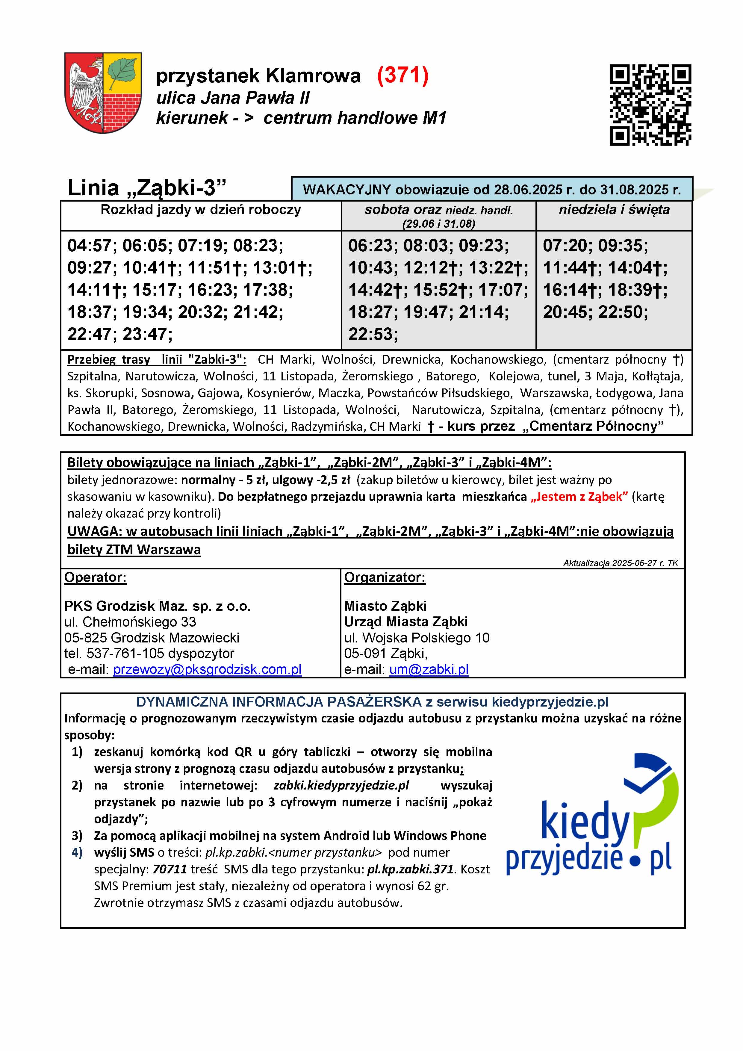 Rozkłady wakacyjne są dostępne na stronie miasta w zakładce "Komunikacja". W godzinach wieczornych w piątek (27.06) nowe rozkłady zawisną na przystankach na terenie Ząbek. Czekamy na aktualizację systemu kiedyprzyjedzie.pl oraz na aktualizację informacji przystankowej na terenie Warszawy, którą realizuje ZTM. Informujemy, że rozkłady Ząbkowskiej Komunikacji Miejskiej (na chwilę obecną tylko statyczne) są dostępne również na platformie https://zbiorkom.live/warsaw , którą przy okazji Państwu polecamy do śledzenia komunikacji ZTM w czasie rzeczywistym.
