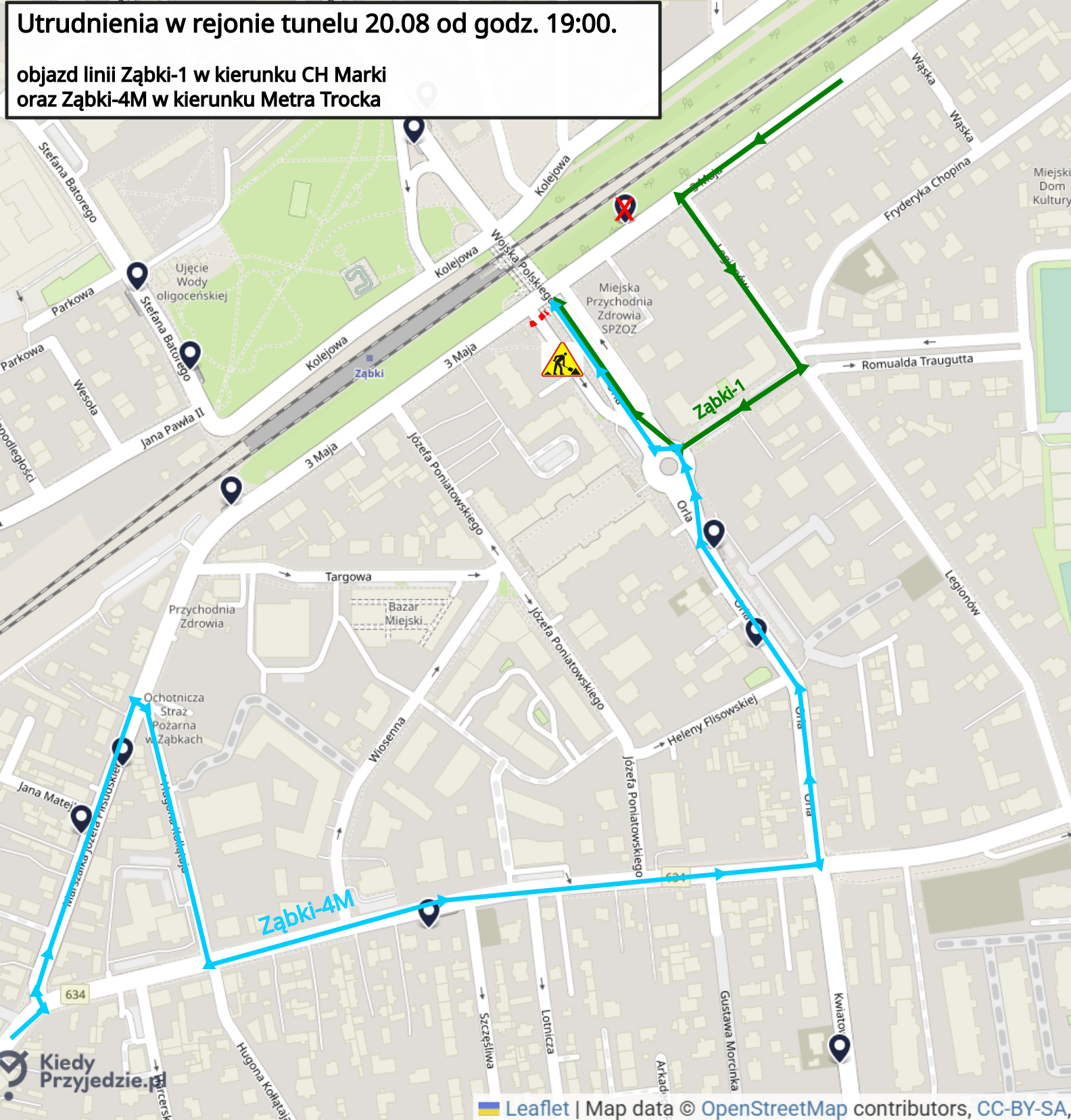 - Autobusy linii Ząbki-4M w kierunku Metra Trocka pojadą trasą objazdową ulicami Piłsudskiego->Kołłątaja->ks. Skorupki -> Orla. Wszystkie przystanki rozkładowe będą obsłużone, przystanki Kołłątaja 02 i Orla 01 znajdujące się na trasie objazdu będą obsługiwane na żądanie.
