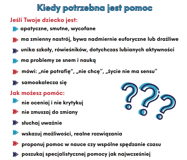 Poniżej załączamy ulotkę, która wskazuje jakie działania mogą i powinni podjąć dorośli, aby wspierać i rozumieć młodzież w ich trudnej codzienności. Należy pamiętać, że wczesna reakcja i wsparcie dorosłych może pomóc nastolatkowi uniknąć pogłębiania się problemów i trudności.