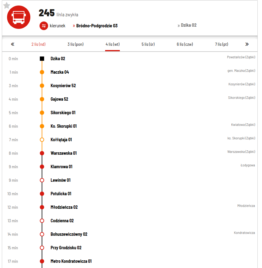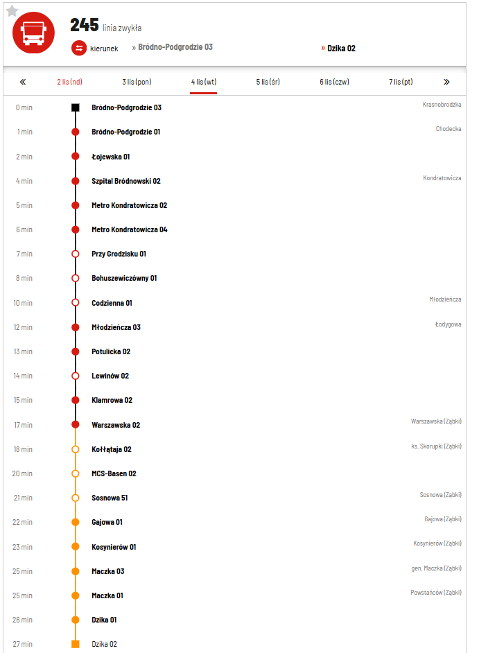 DZIKA [02] – Powstańców – gen. S. Maczka – Kosynierów – Gajowa – gen. W. Sikorskiego – Kwiatowa – ks. I. Skorupki – marsz. J. Piłsudskiego – Warszawska – … – BRÓDNO-PODGRODZIE.