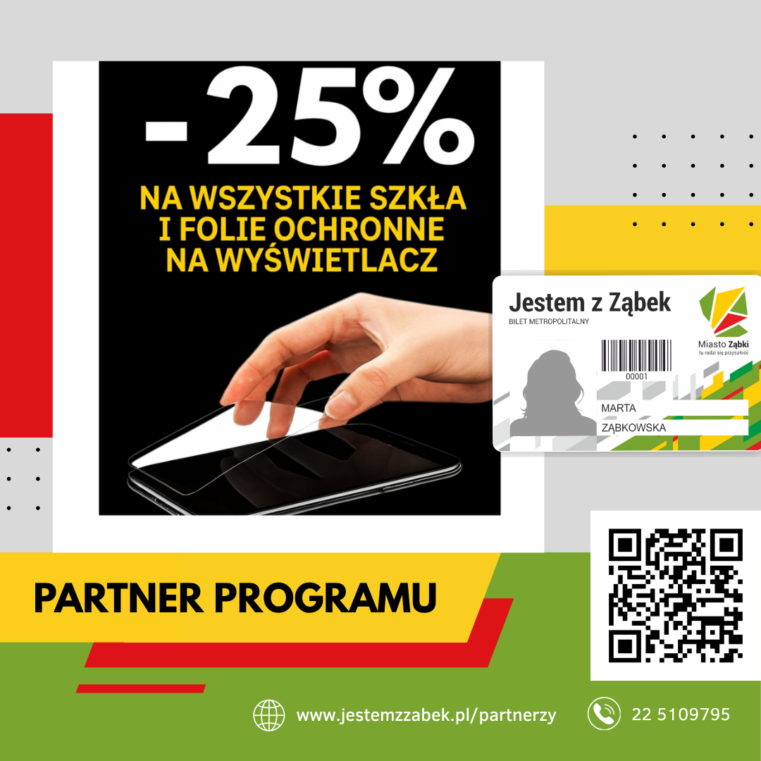 Z Kartą Mieszkańca „Jestem z Ząbek” otrzymasz -25% rabatu na wszystkie szkła i folie ochronne na wyświetlacz w punkcie partnerskim Strefa GSM!