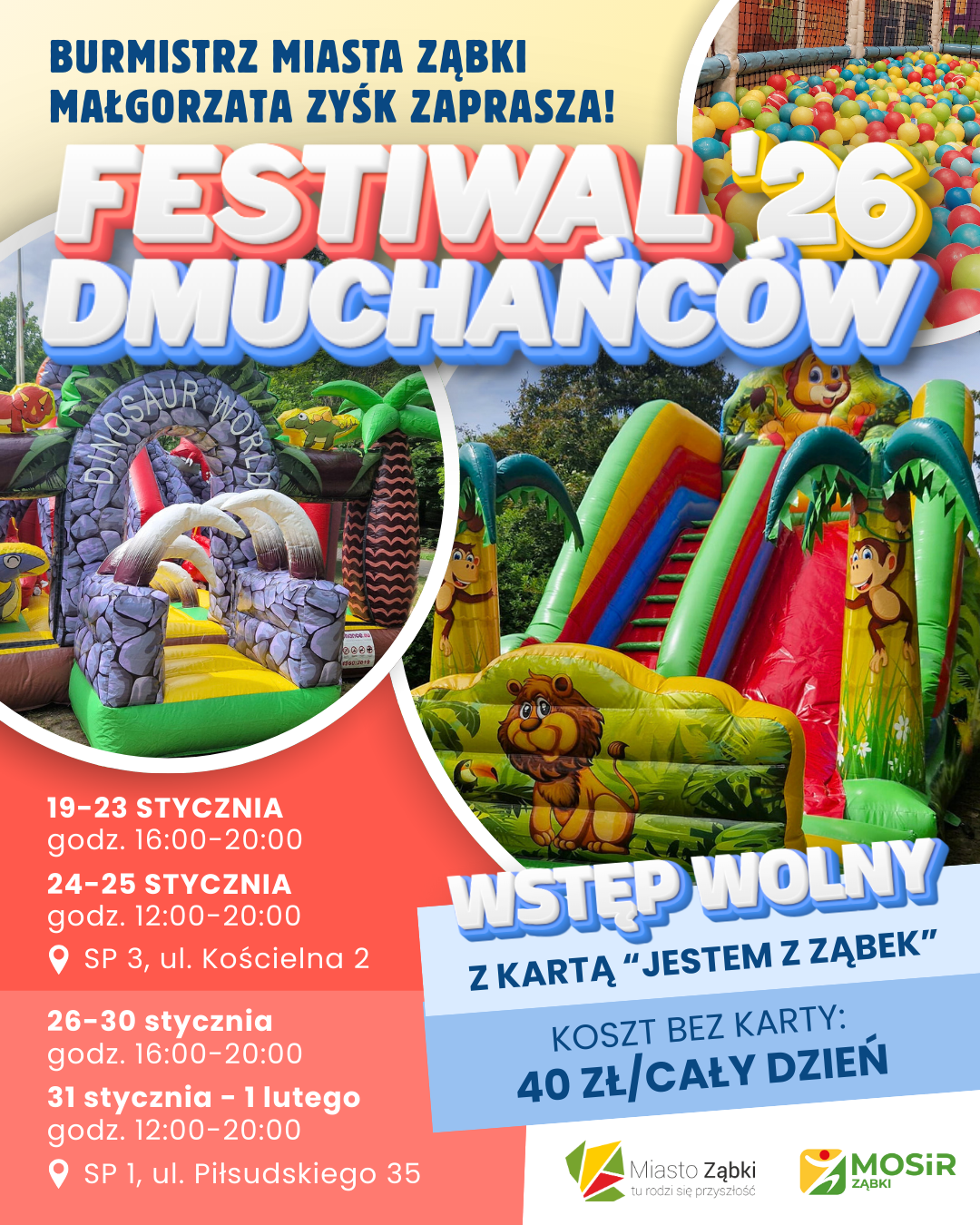 Z kartą "Jestem z Ząbek" WSTĘP WOLNY! Mieszkańcy Ząbek mogą korzystać z atrakcji bezpłatnie przez cały festiwal. Bez karty mieszkańca można wykupić wstęp na cały dzień za 40 zł.