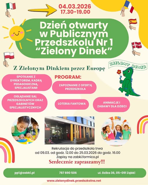 Już 4 marca 2026 r. (17:30–19:00) zapraszamy wszystkich Rodziców wraz z dziećmi do Publicznego Przedszkola Nr 1 „Zielony Dinek” przy ul. Dzikiej 36 w Ząbki.