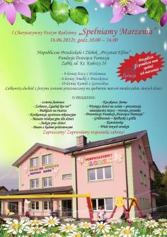 Niepubliczne Przedszkole i Żłobek "Przystań Elfów" oraz Fundacja "Dziecięca Fantazja" zapraszają na I Charytatywny Festyn Rodzinny, który odbędzie się w sobotę 16.06.2012r. w godz. 10.00 – 16.00 przy Niepublicznym Przedszkolu "Przystań Elfów" w Ząbkach ul. Ks. Kuleszy 24.