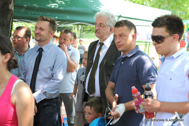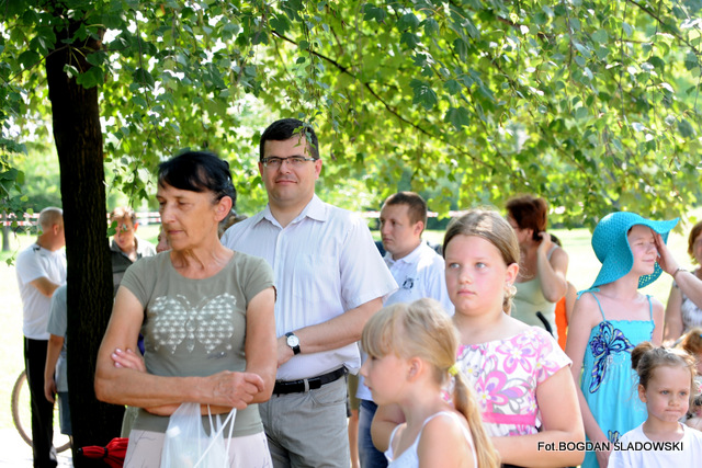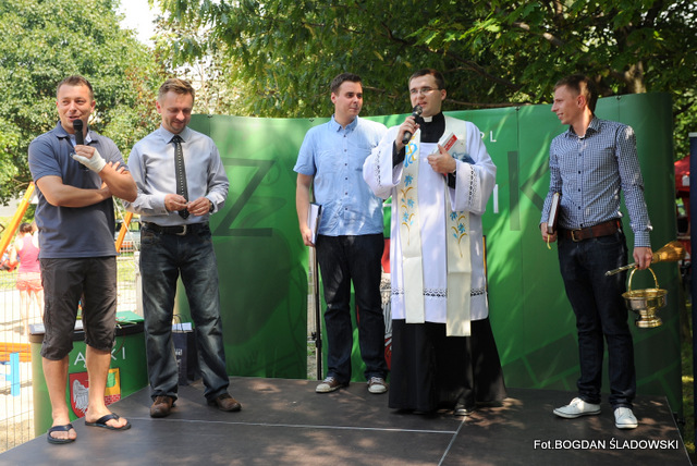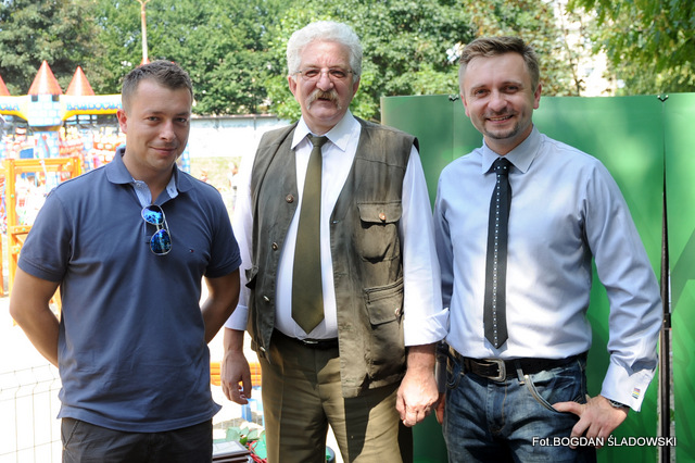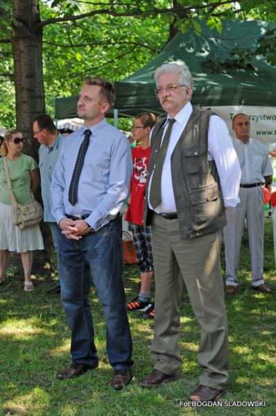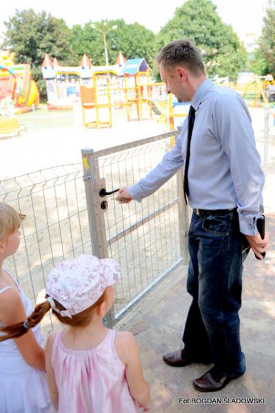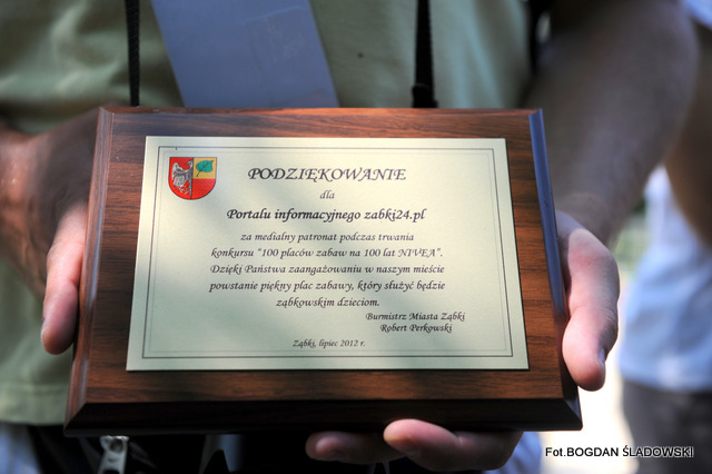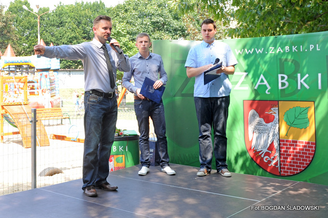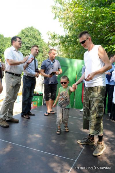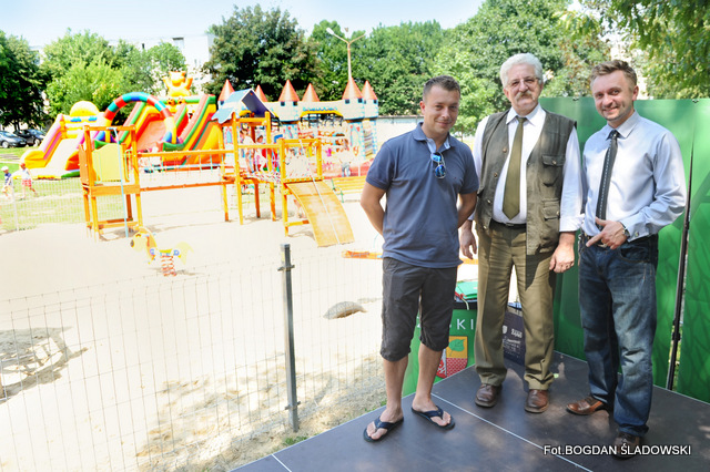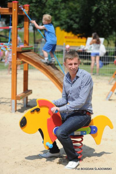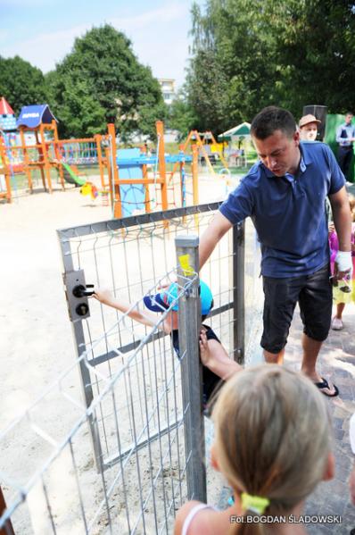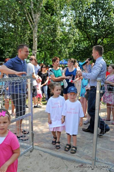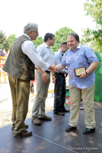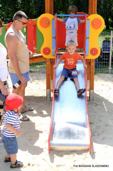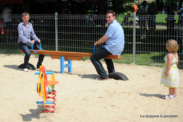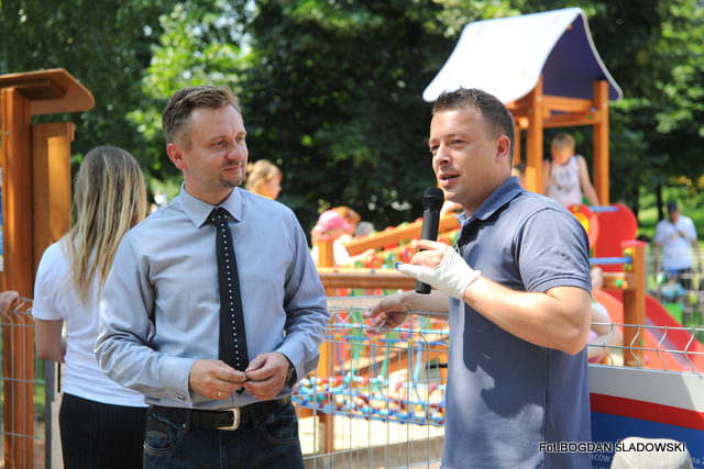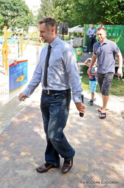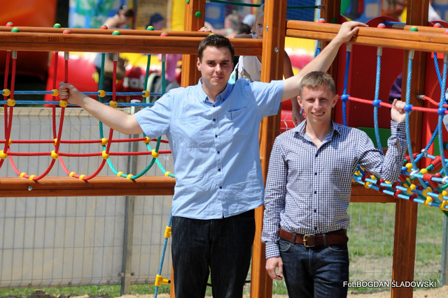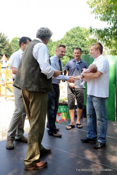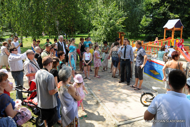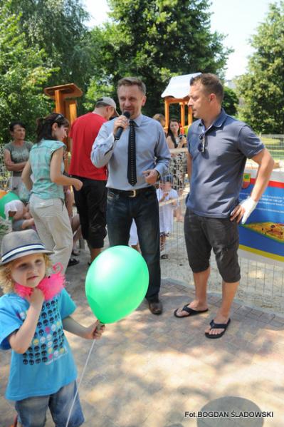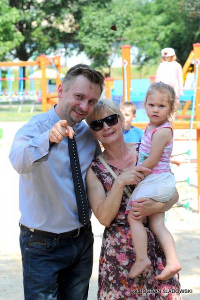 Uroczysta muzyczna zapowiedź i na scenie pojawił się gospodarz Miasta wraz ze swym zastępcą Arturem Murawskim. Burmistrz w kilku słowach przypomniał ideę powstawania placu zabaw i podkreślił, że powstał on dzięki zaangażowaniu mieszkańców i zapalonych internautów, którzy go po prostu "wyklikali" w konkursie internetowym ( oddano 72.365 głosów)- Burmistrzowie zeszli ze sceny i skierowali się do wejścia.