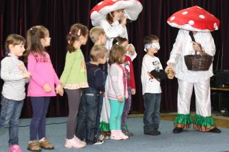 Znudziło im się nieruchome stanie w lesie, więc odwiedziły przedszkolaki. Jak nietrudno się domyślić, radość dzieci była ogromna. Grzybki okazały się być świetnymi wodzirejami i miały tak mnóstwo pomysłów na dobrą zabawę, że nikt się nie nudził. Atrakcji było co niemiara: zagadki, konkursy, gry zręcznościowe, "tańce połamańce", dłuuuugi pociąg i chyba jeszcze dłuższy wąż. Na zmęczonych i głodnych czekały stoły uginające się od smakołyków. Dwie godziny minęły jak z bicza strzelił i chyba nikomu nie chciało się wracać do domu. Teraz z niecierpliwością czekamy na wiosenny piknik. Ciekawe, kto wtedy zawita do naszego przedszkola?