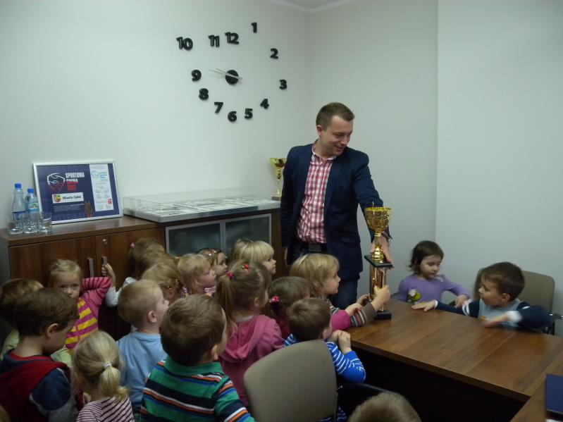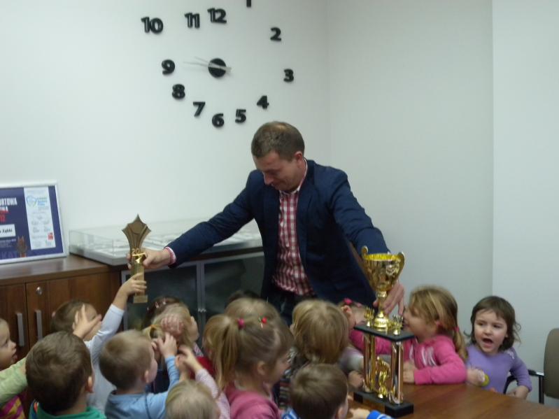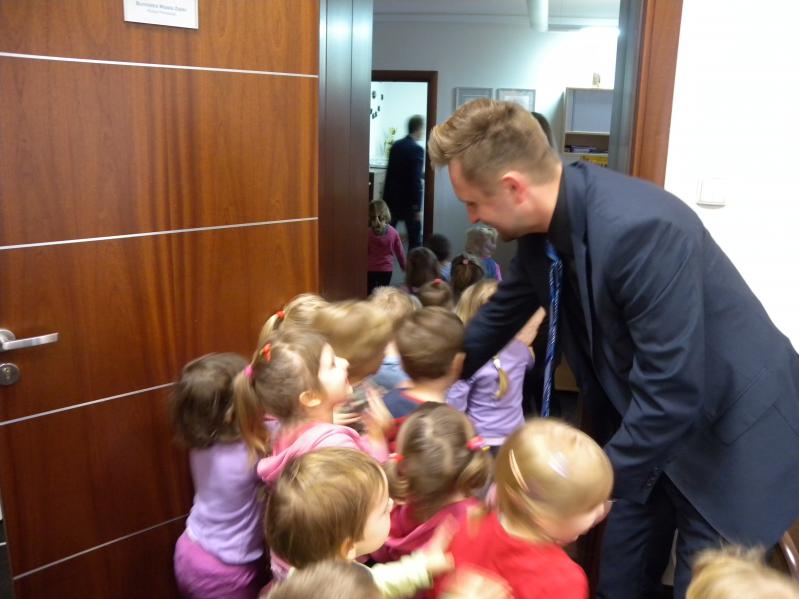 Już o godzinie 9.30 dzieci odwiedziły Roberta Perkowskiego burmistrza miasta. Tutaj po osobistych powitaniach, burmistrz zaprezentował dzieciom flagi: Polski, Unii Europejskiej i Województwa Mazowieckiego. Potem były ważne dyplomatyczne rozmowy oraz przekazanie suwenirów. Przedszkolaki otrzymały od burmistrza piłeczki z herbem miasta Ząbki, a burmistrz od dzieci – zaproszenie na pasowanie. Następnie osobiste pożegnania i przejście do gabinetu Artura Murawskiego zastępcy burmistrza. Tam maluchy obejrzały sportowe trofea: statuetki i puchary. Dla chętnych było specjalne zadanie. Można było ze statuetką podniesioną w ręku wysoko do góry krzyczeć: jestem najlepszy!, z czego skorzystali co odważniejsi.