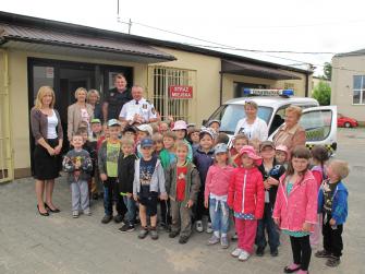 W nagrodę otrzymaliśmy widokówki z naszego miasta z pieczątką i autografem Pana Burmistrza. My też przygotowaliśmy nasze autografy na obrazku z ZIELONYM DINKIEM, a nasze Panie wręczyły Dyplom Przyjaciela Przedszkola Nr1. Pan Burmistrz bardzo się ucieszył i obiecał, że odwiedzi nas w przedszkolu, bo przyjaciele przecież lubią się spotykać. W małym budynku obok czekała nas następna niespodzianka spotkanie ze Strażnikami Straży Miejskiej i samym Panem Komendantem. Panowie w mundurach wyglądali wspaniale! Nawet Pani Kasia była zachwycona! Chcieliśmy poczuć się tak samo i chętnie zasiedliśmy w służbowym samochodzie, mogliśmy nawet porozmawiać przez radiostację. Zabawie nie byłoby końca, gdyby nie Pan Komendant, który już czekał z górą smacznych cukierków. Podziękowaliśmy za wspaniałe przyjęcie, a panowie postanowili odprowadzić nas na skrzyżowanie i sprawdzić naszą znajomość zasad ruchu drogowego.