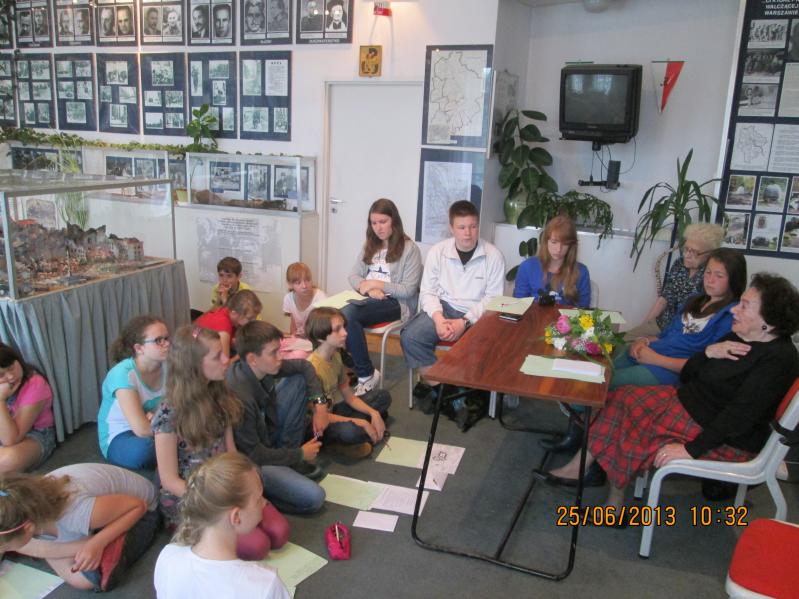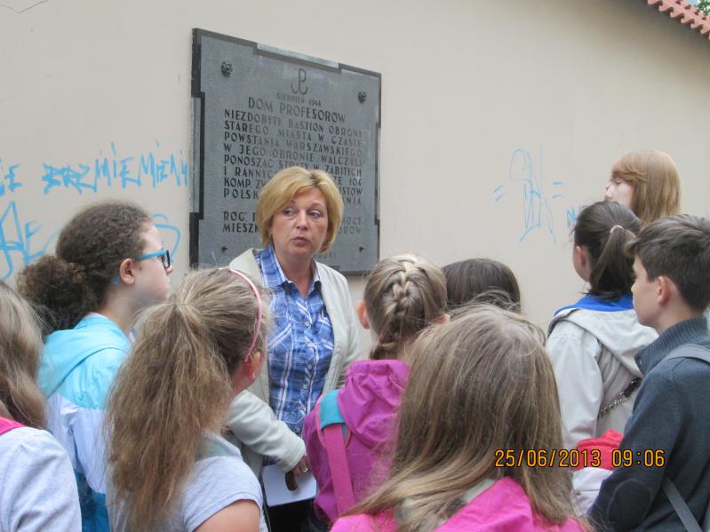 z wmurowaną tablicą upamiętniającą wprowadzenie przez żołnierzy kompanii "Anna" pancernego wozu pułapki na ulicy Kilińskiego. Nie można było ominąć pomnika Małego Powstańca- patrona naszej szkoły, o którym opowiadali już sami uczniowie. Wycieczka zakończyła się w Związku Powstańców Warszawskich. W Sali historycznej uczniowie koła przeprowadzili wywiad z sanitariuszką powstania Panią Jolantą Kolczyńską. Podczas wywiadu Pani Jolanta opowiadała o swoim dzieciństwie, powstaniu i czasach po wojnie.