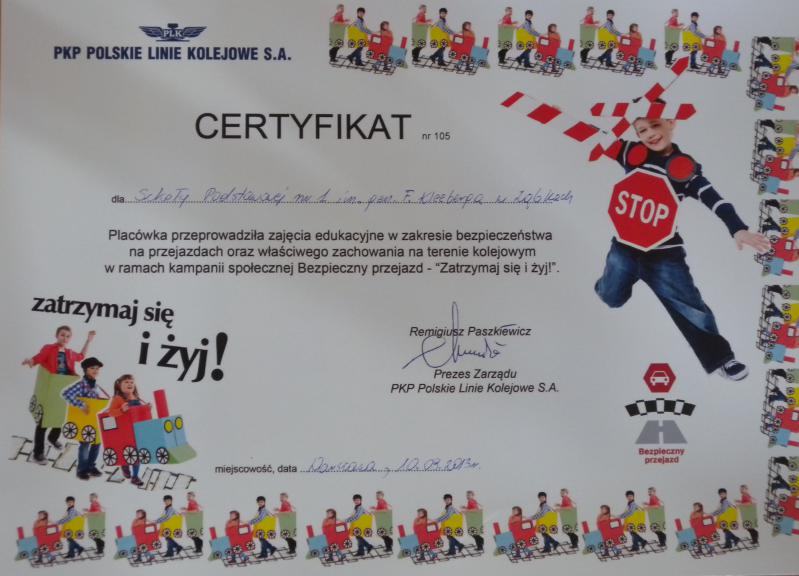 Na zakończenie dyrektor Telecki wręczył dyr. szkoły Agnieszce Piskorek certyfikat uczestnictwa szkoły w kampanii promocyjnej "Bezpieczny przejazd" i podziękował dyrekcji szkoły za zaproszenie, pedagogom za uczestnictwo, a władzom miasta za przychylność i zainteresowanie tematem bezpieczeństwa na przejazdach kolejowych.