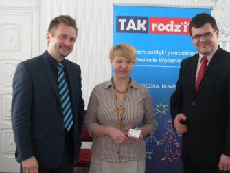 Wszyscy jednak wiemy, że szczególnie w dzisiejszych trudnych czasach stanowi ostoję, daje poczucie bezpieczeństwa i uskrzydla do różnych działań społecznych i zawodowych. Niestety bardzo często się zdarza, że polskie rodziny borykają się z wieloma trudnościami finansowymi. Wychodząc naprzeciw ich problemom starosta powiatu wołomińskiego wraz z włodarzami miast i gmin wdrożyli w życie akcję pod nazwą TAKrodzina.pl wydając najpotrzebniejszym specjalne karty rabatowe. Pierwszą z nich otrzymała Pani Beata, mama trójki dzieci, pracująca w Szkole Podstawowej nr 3 w Ząbkach. Karty wręczyli starosta Piotr Uściński i burmistrz Ząbek Robert Perkowski.