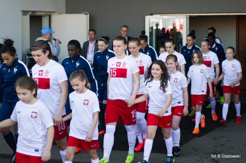 Zawodniczki reprezentacji Polski i Francji – skład B, wprowadzone zostały na płytę boiska przez kapitanów drużyn: Aleksandrę Sikorę i Catala Camille. Na początek odegrano Marsyliankę i Mazurek Dąbrowskiego.