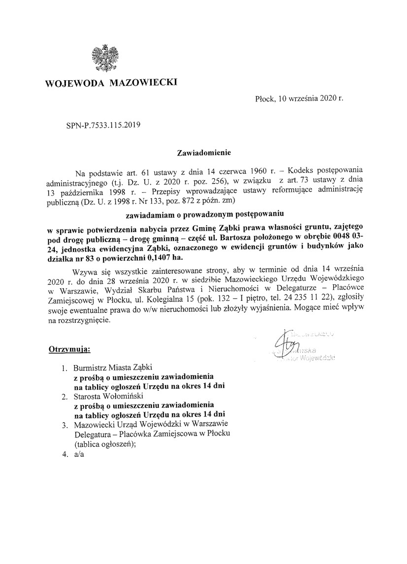 Decyzja Wojewody Mazowieckiego nr 394/P/2020 z dn. 13.08.2020 r. stwierdzająca nabycie przez Gminę Ząbki_część ul. Brzozowej w Ząbkach
